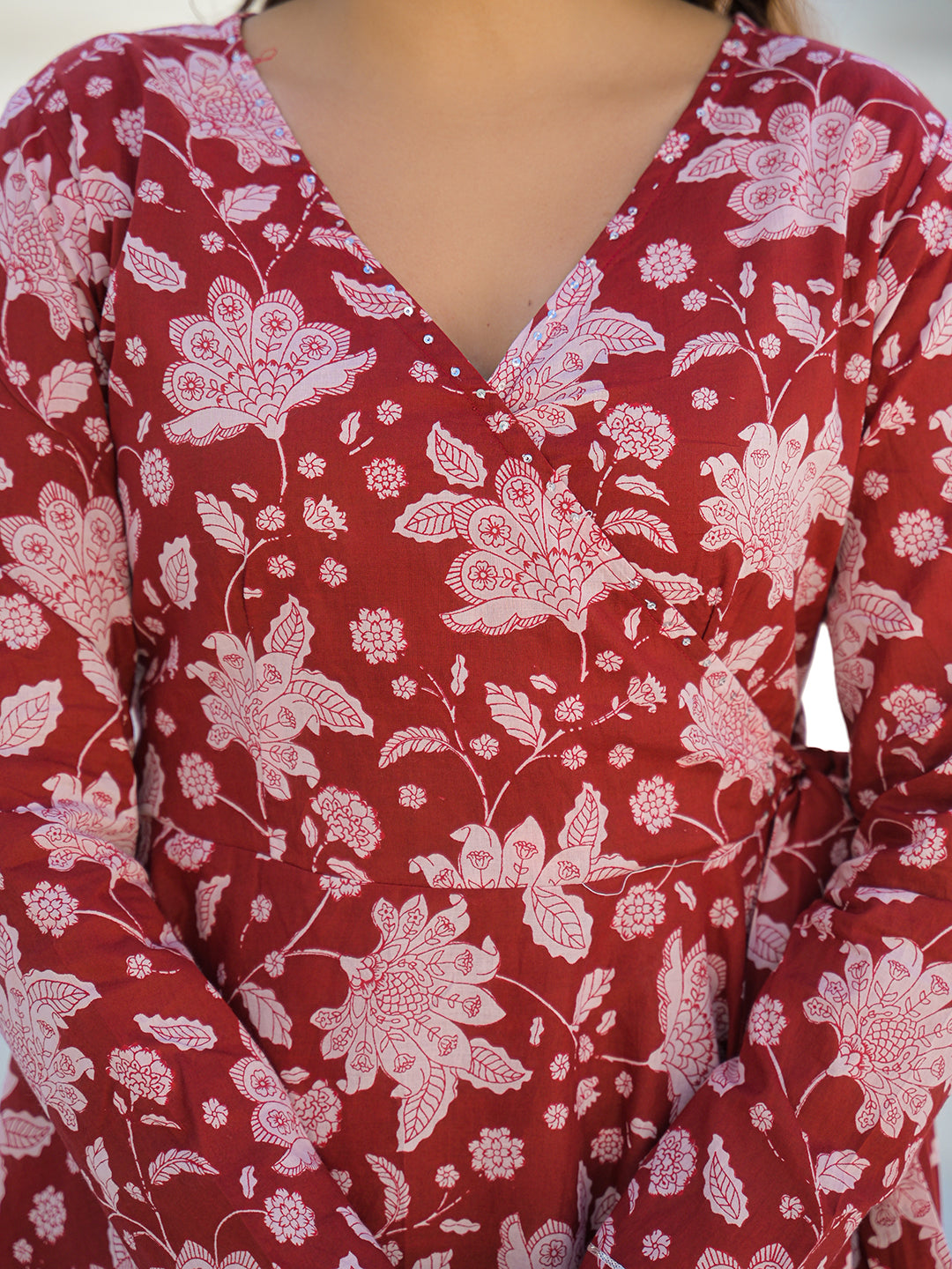 Elevate your ethnic wardrobe with the stunning Divena Maroon Anarkali Angrakha Floral Cotton Kurta Pant Set. Made from premium quality cotton, this set features a beautiful angrakha style top with intricate floral embroidery and a comfortable pant. Perfect for any festive or special occasion, shop now and add a touch of elegance to your traditional look.