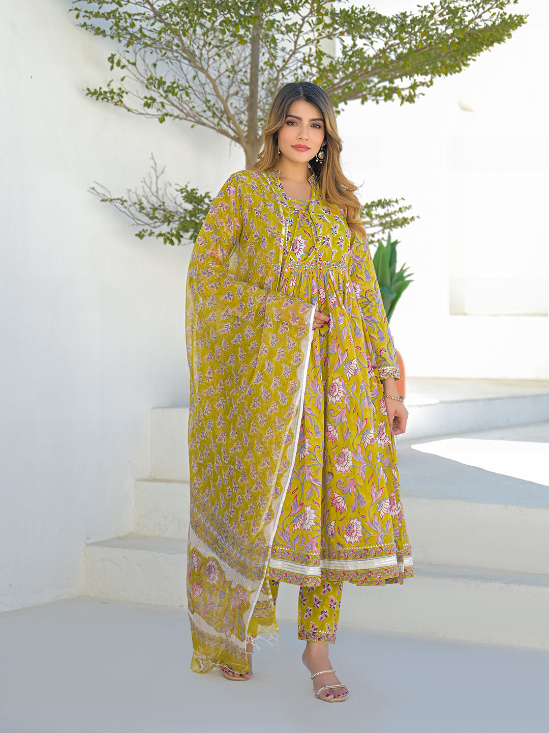Discover the beautiful Divena Mustard Hand Block Cotton Anarkali Kurta Pant Set With Dupatta. Perfect for any occasion, this set features an intricately designed anarkali kurta and comfortable pants, finished with a matching dupatta. A must-have addition to your wardrobe. Shop now!