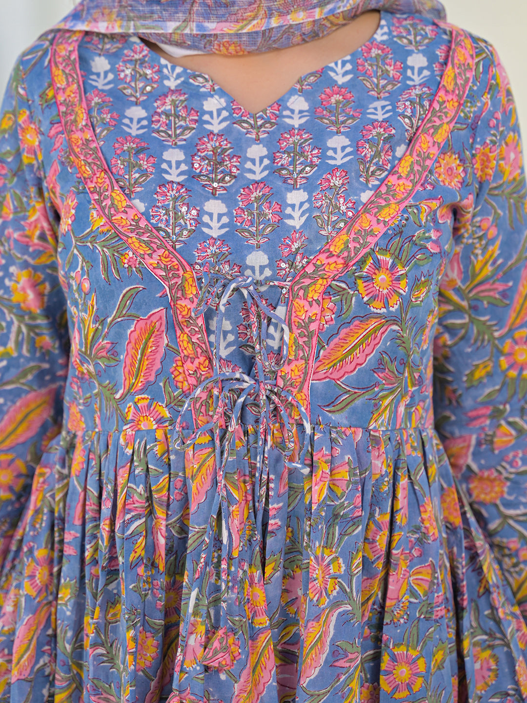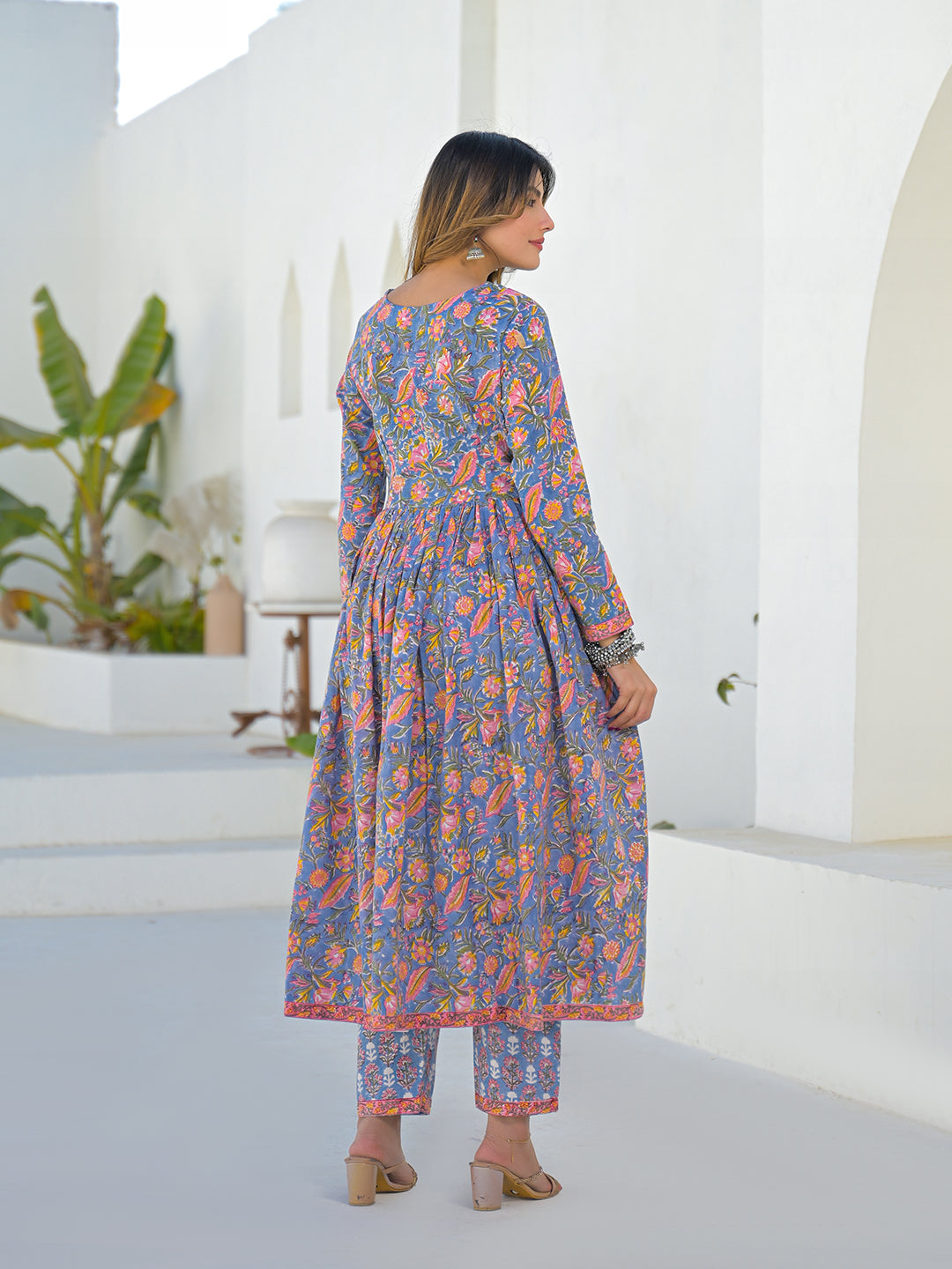 Divena Sky Blue Hand Block Cotton Anarkali Kurta Pant Set With Dupatta