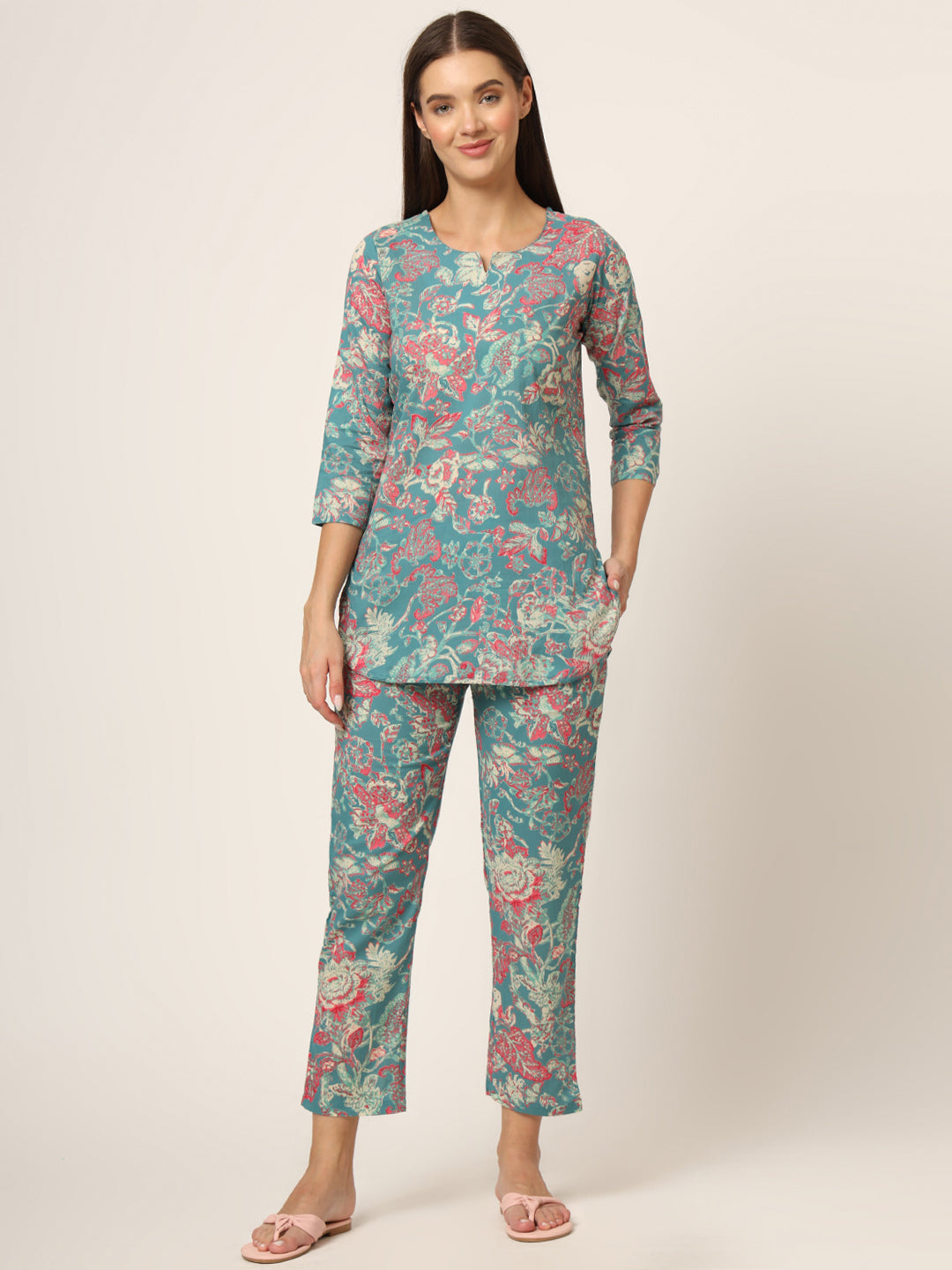 Divena Green Floral Print Cotton Regular Fit Night Suit