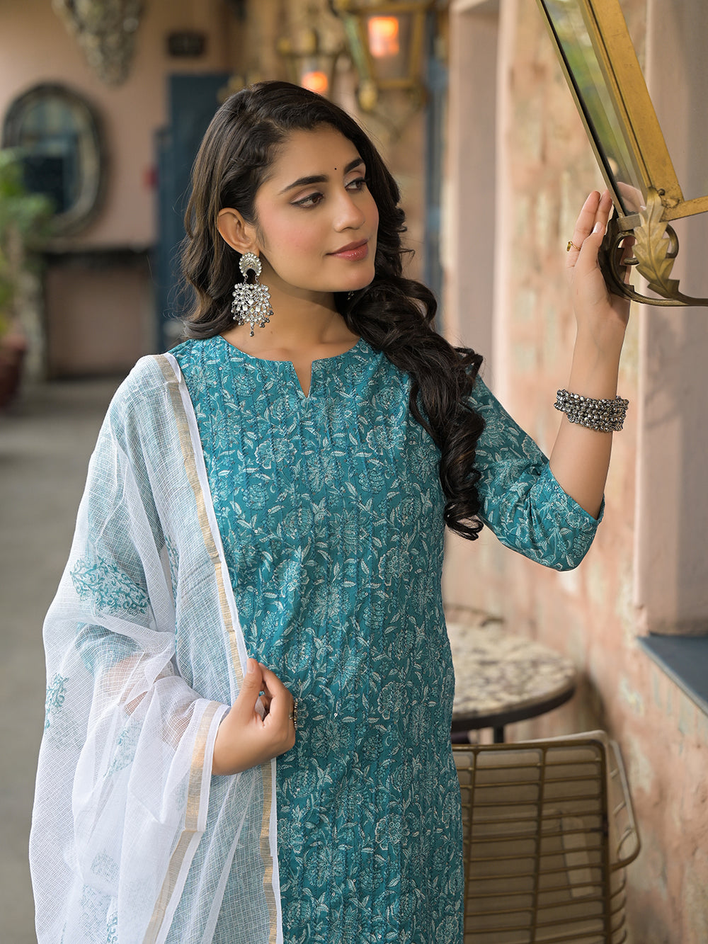 Divena Teal Blue Cotton Kurta Pant with Dupatta