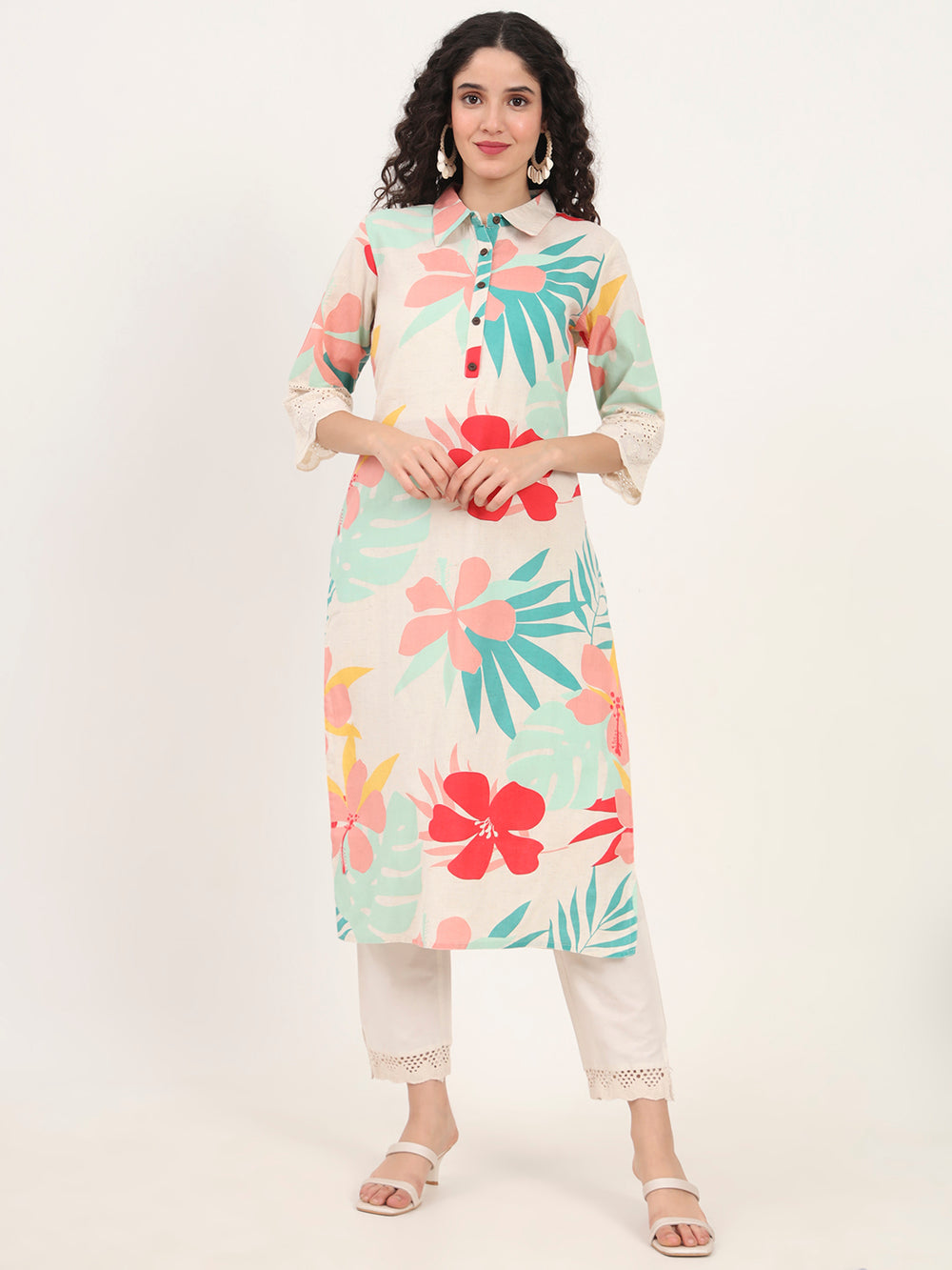 Divena Turquoise Blue Floral Printed Cotton Kurta. This style would likely feature a vibrant pink color with floral prints, making it a perfect option for casual wear or festive occasions. The cotton fabric adds to the comfort and breathability, making it great for warm weather or daily wear.