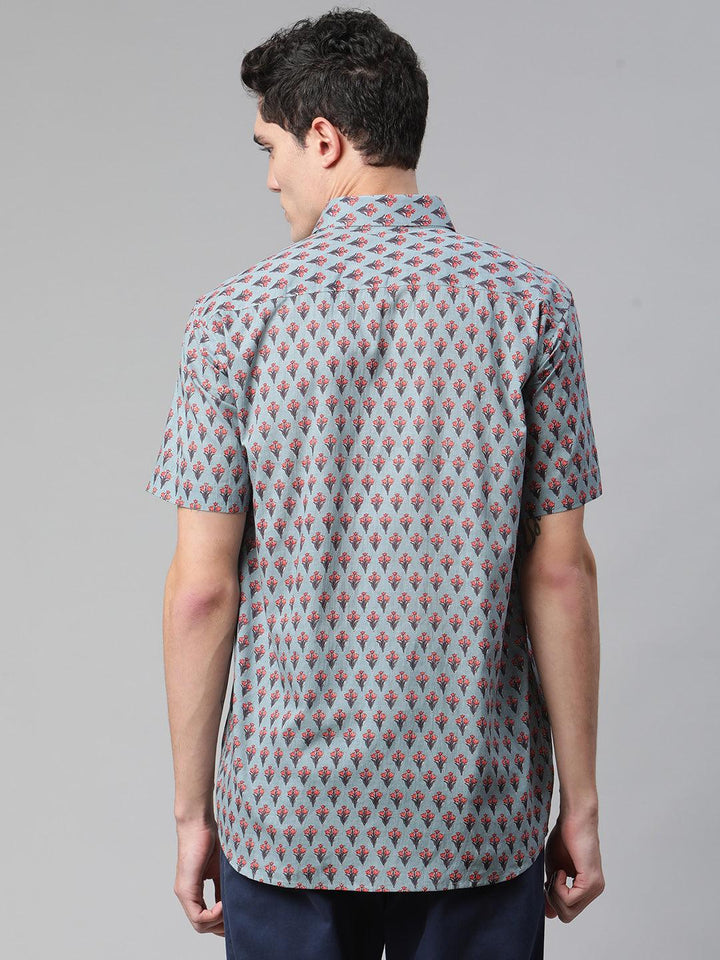 Light Blue & Red printed casual shirt, has a spread collar, short sleeves, button placket, curved hem, and 1 patch pocket