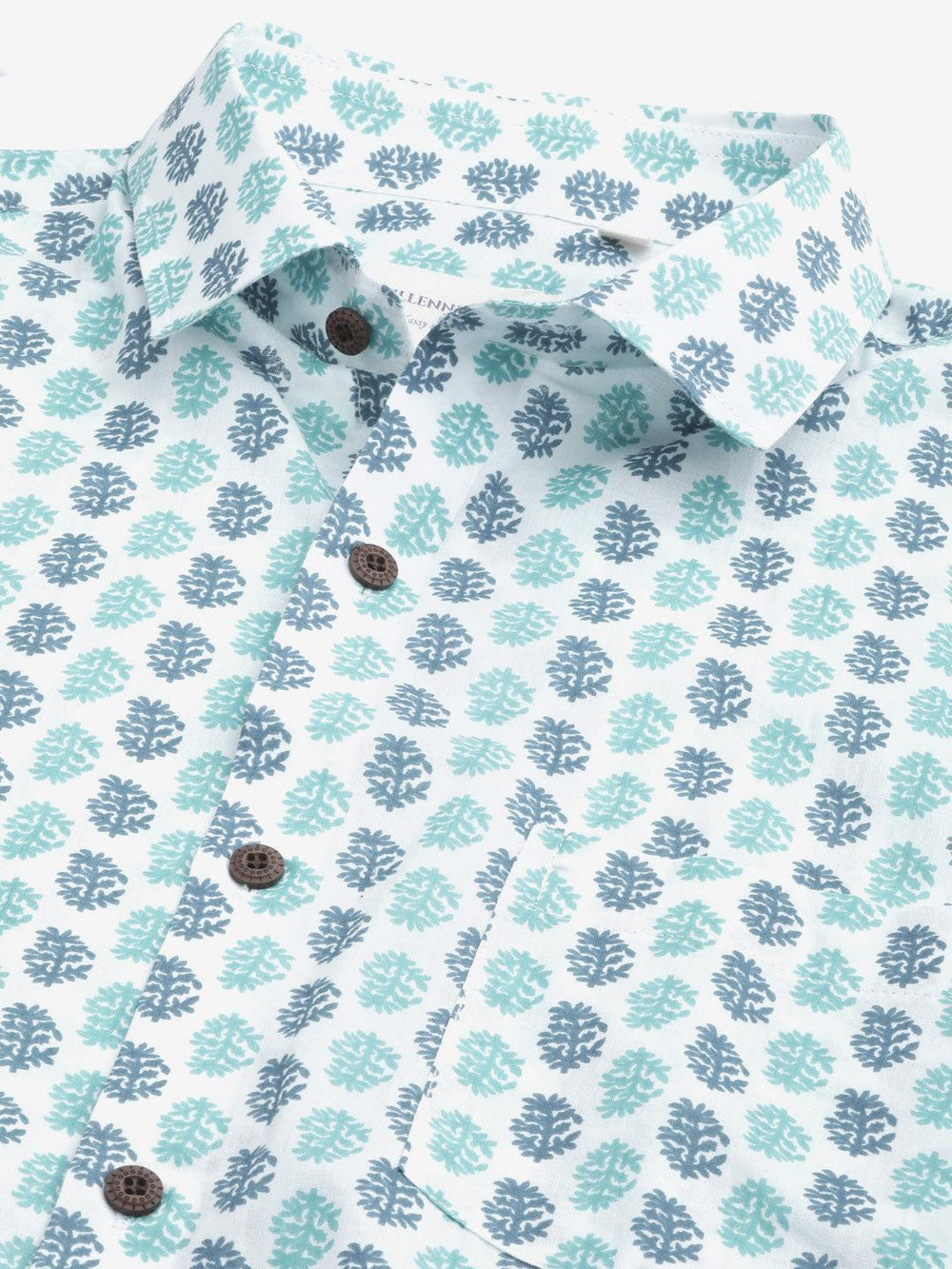White & Green printed casual shirt, has a spread collar, short sleeves, button placket, curved hem, and 1 patch pocket